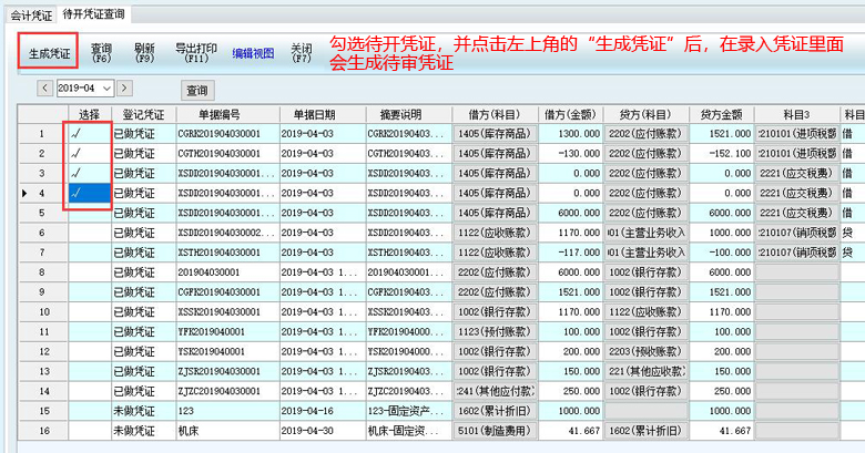 单击会计凭证功能模块,进入“待开凭证查询”,勾选凭证单据,点左上角的“生成凭证”,在凭证录入里面会生成一张待审核凭证,点审核按钮后该张凭证生效