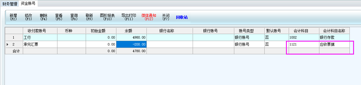 ①创建一个资金账号叫做“承兑汇票”,关联会计科目“应收票据”