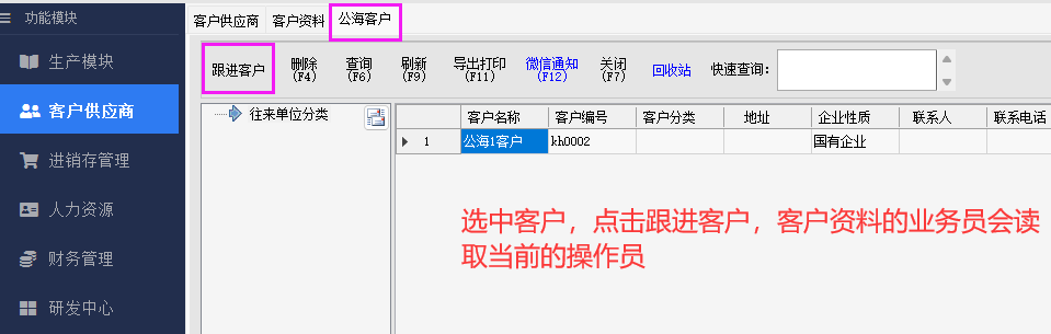 操组员在公海客户里点击跟进客户,可引入到客户资料,并且业务员自动读取为当前操作员。