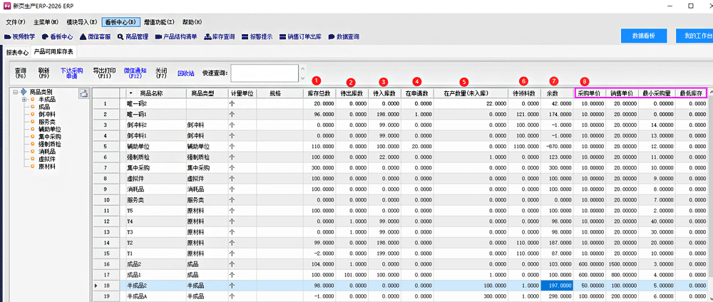 7.余数:库存数-待出库数+待入库数+在申请数+在产数-待领料数